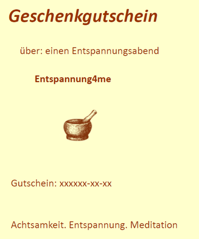 Als Geschenkoptionen stehen Dir sowohl eine frei wählbare Anzahl an Entspannungsabenden als auch das Kursangebot zur Verfügung.